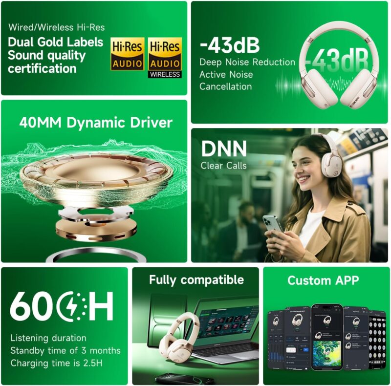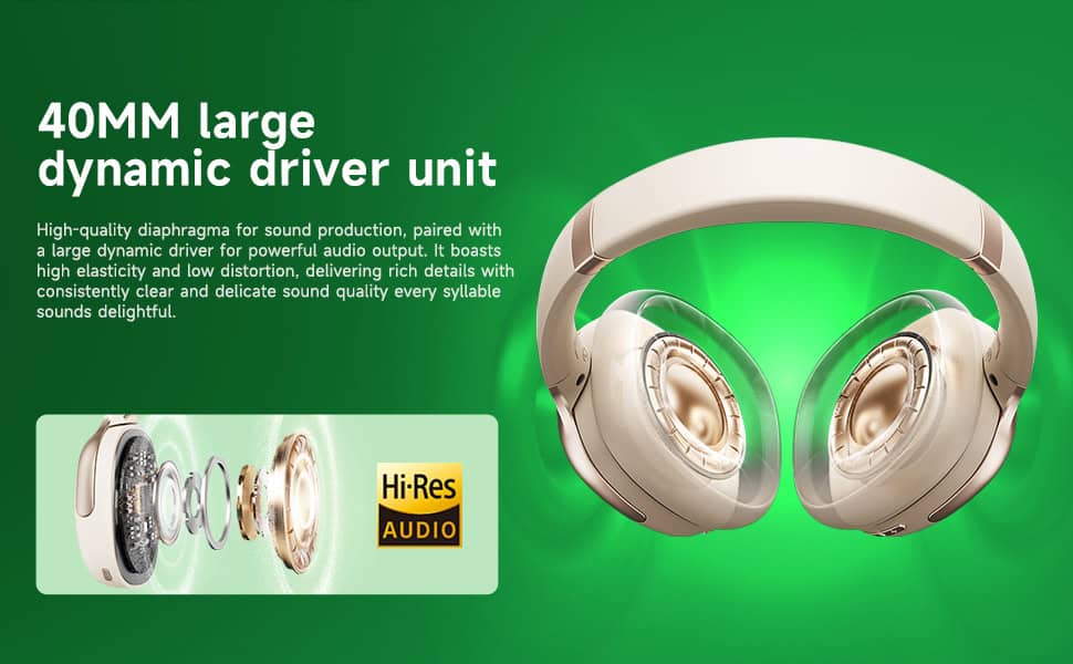 1. Hybrid Active Noise canceling: Four microphones and a digital active noise cancellation algorithm detect and filter out up to 90% of low- and mid-frequency sounds. The custom 40 mm dynamic drivers reproduce music with rich details and extraordinary clarity for a heightened listening experience.
